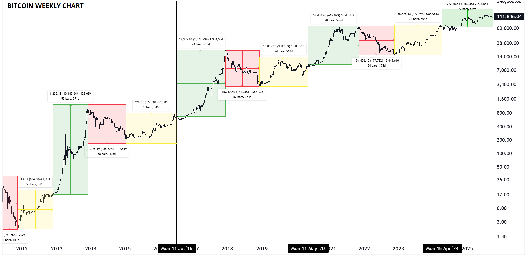 As one TradingView chart shows halving cycles, we’re mid-phase—dips precede parabolic legs.